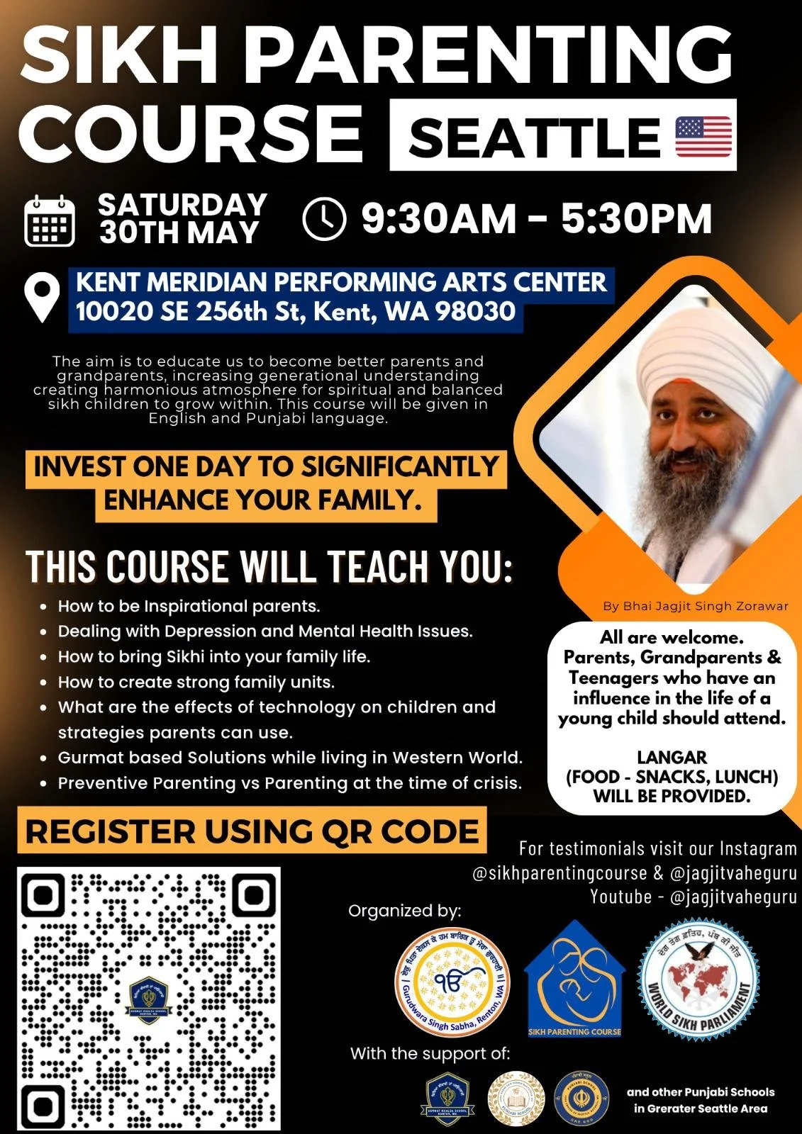 Sikh Parenting Course hosted by Bhai Jagjit Singh Ji Zorawar is taking place on Saturday May 30th, 2026 from 9:30am to 5:30pm @ Kent Meridian Performing Arts Center. Click the button on the right to fill out the registration form.